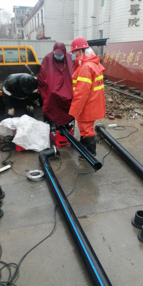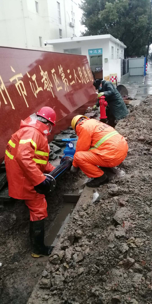 疫情就是命令,保供水就是責(zé)任。龍泉公司在接到緊急任務(wù)后,立即明確專人負(fù)責(zé),成立施工突擊隊(duì),并迅速派人赴區(qū)第三人民醫(yī)院擴(kuò)建工程現(xiàn)場實(shí)地查勘,向院方詳細(xì)了解擴(kuò)建工程供水需求、施工進(jìn)度安排等,并與院方共同研究,現(xiàn)場確定擴(kuò)建工程的接水方案。2月15日上午,搶修人員佩戴口罩、安全帽,進(jìn)行了體溫測量,冒著雨雪趕赴現(xiàn)場,投入到緊張的施工工作中,由于前期施工方案細(xì)致、工作準(zhǔn)備充分,經(jīng)過10個(gè)小時(shí)的奮戰(zhàn),于當(dāng)天晚上8點(diǎn)順利完成了自來水管道的擴(kuò)建安裝任務(wù)。
