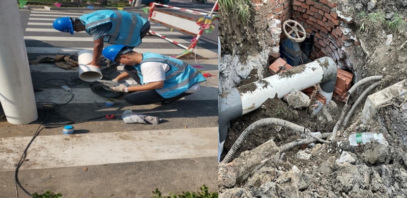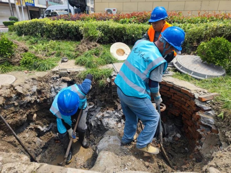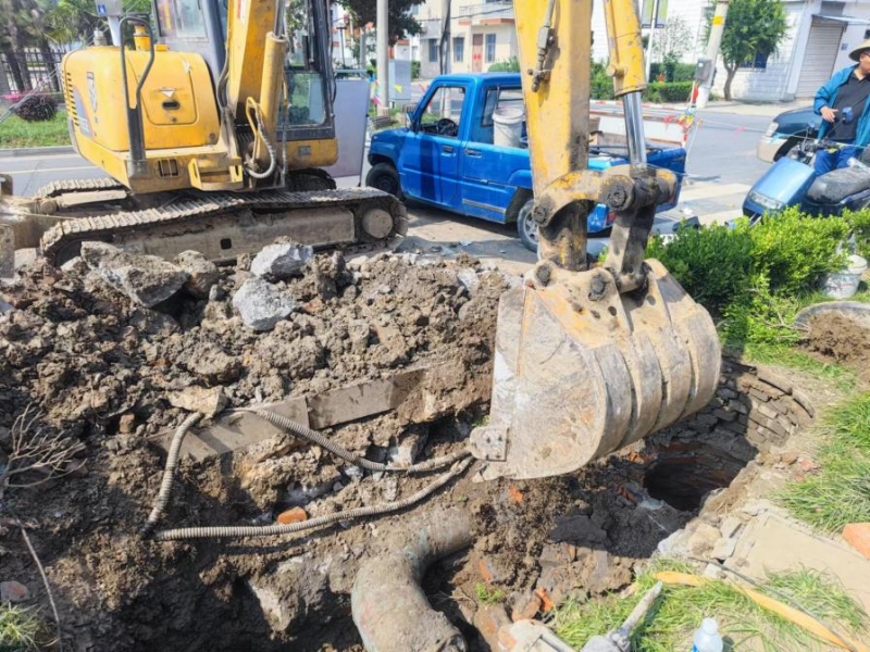 此次維修的是老水廠鋪設的DN200的PVC管道,但在施工過程中遇到了較多困難,當挖掘機破開路面時,發(fā)現(xiàn)需要破除80公分左右厚度的混凝土,但中間是DN300的鋼管,漏點卻在鋼管下方的PVC管與球管連接處,這無疑給施工增加了很大的難度。挖掘機施工時,稍有不慎就會破壞中間鋼管,只能通過手動一邊用風鎬、洋鎬等進行破碎,一邊用鐵鍬進行開挖,同時還需要抽水作業(yè)。由于當天室外氣溫高達34攝氏度,烈陽高照,汗水早已浸濕了現(xiàn)場施工人員的衣服,但他們不怕苦、不怕累,克服各種困難,通過3個小時不間斷地搶修,最終完成這段老舊管道的維修更換。